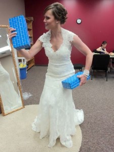 My sister had to run to a department store to get the security tag removed from her bridesmaid dress with the company of another bridesmaid while my MOH and fourth bridesmaid waited at the studio to see if they could grab my veil. Luckily, they all made it back safely and the veil found its way back to me (Thanks, Karyn!). We had a few hours to kill, so we scarfed down some sandwiches, sprayed our legs tan (or rubbed foundation on them – I’ll spare using a name here!), took our bridesmaids pictures, and lifted some weights to look fit on our walk down the aisle ;).