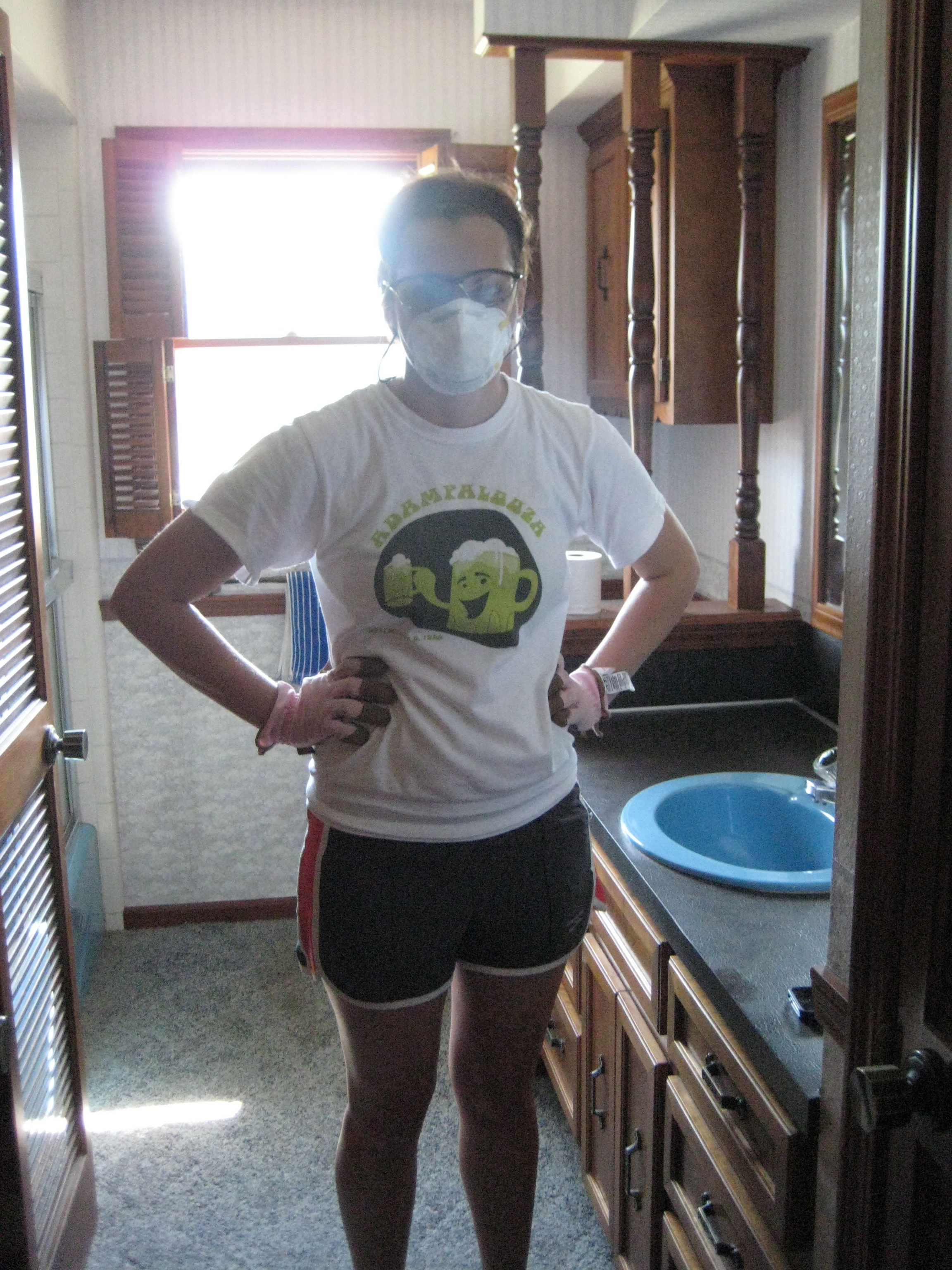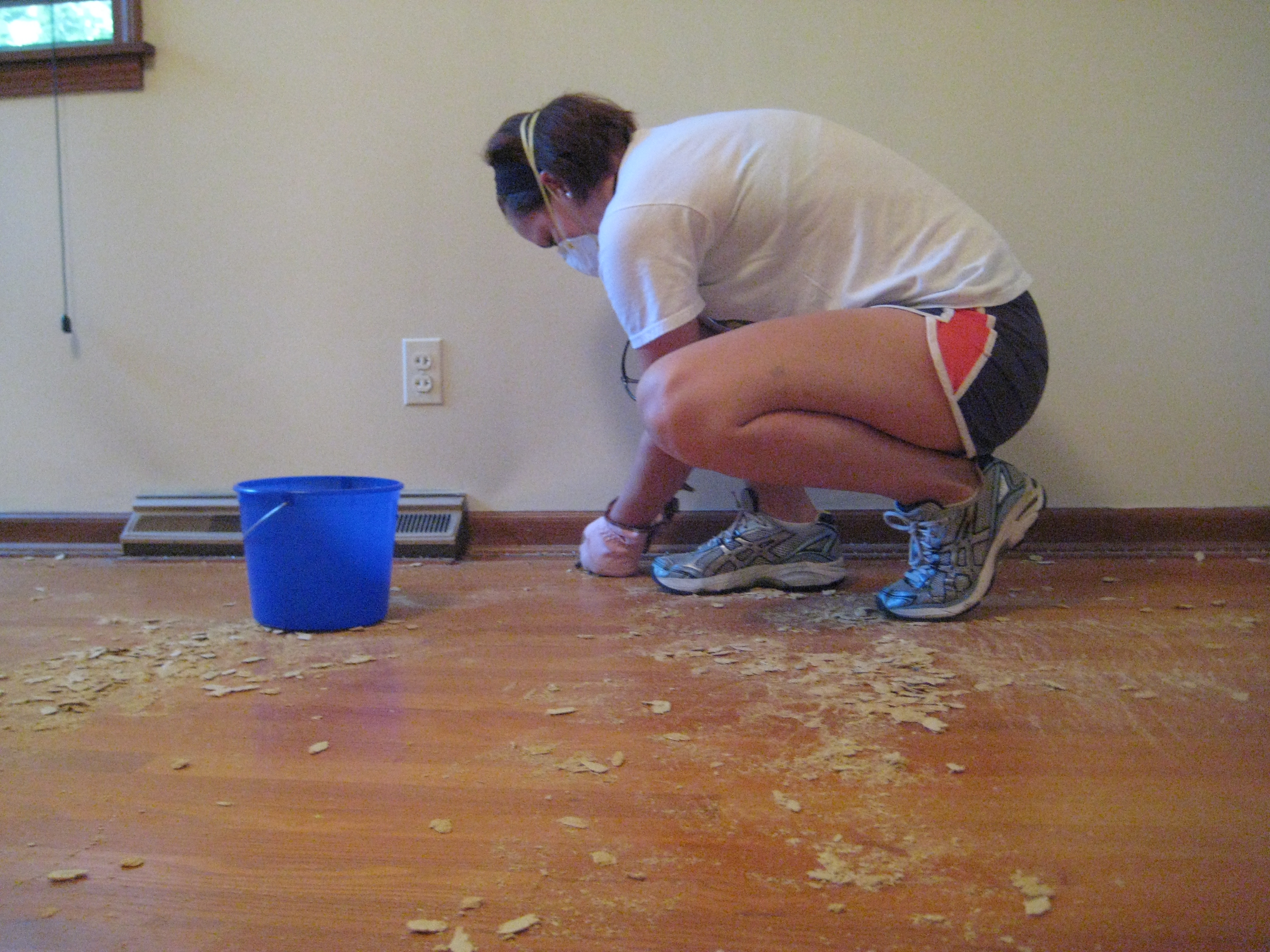 We really only worked for about 2 1/2 – 3 hours before we had to call it quits for Freddy to get to work and me to make a wedding dress shop date with my girlfriend (Congrats on finding your dress so quickly, Lina!) but we got a ton done! The carpet was ancient and came up like notebook paper off a spiral ring – so easy!