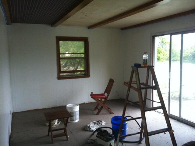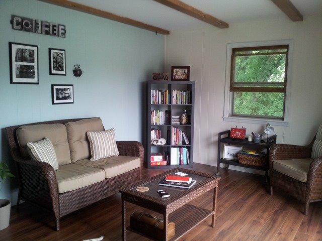 And then, Independence Day came along and with it the sale we had been waiting for! Although completely enclosed and properly heated, the reading room has a sun porch feel with the big slider over looking the deck, lawn, and lake. We debated for a while what furniture would be at home in the room and finally decided that patio furniture was much better match than couches and overpriced armchairs.