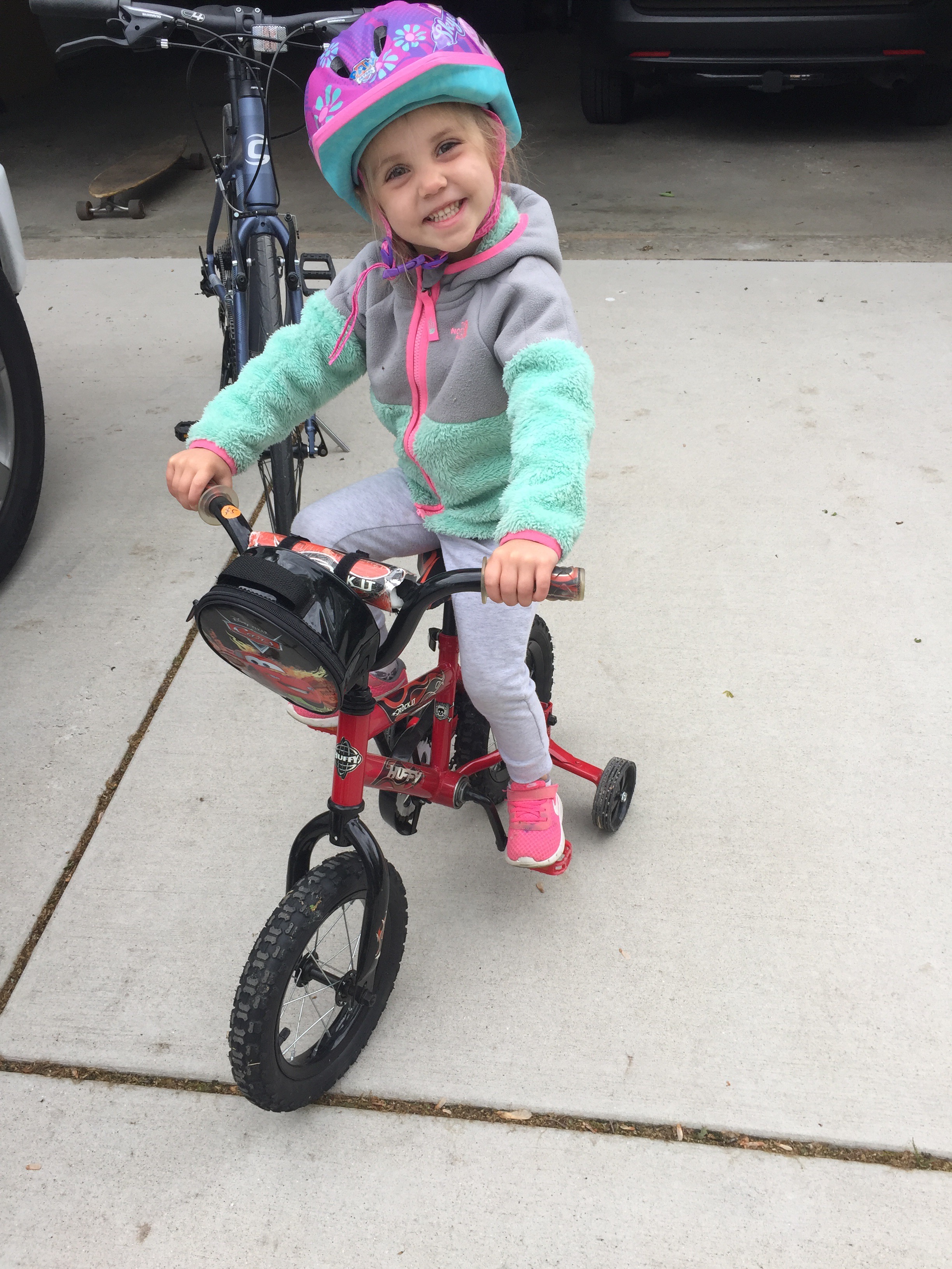 Some on bike with my beautiful and ever-surprisingly-capable three year old daughter (Do you ever stop feeling amazed at what your child can accomplish?) who got a big girl bike with training wheels today!